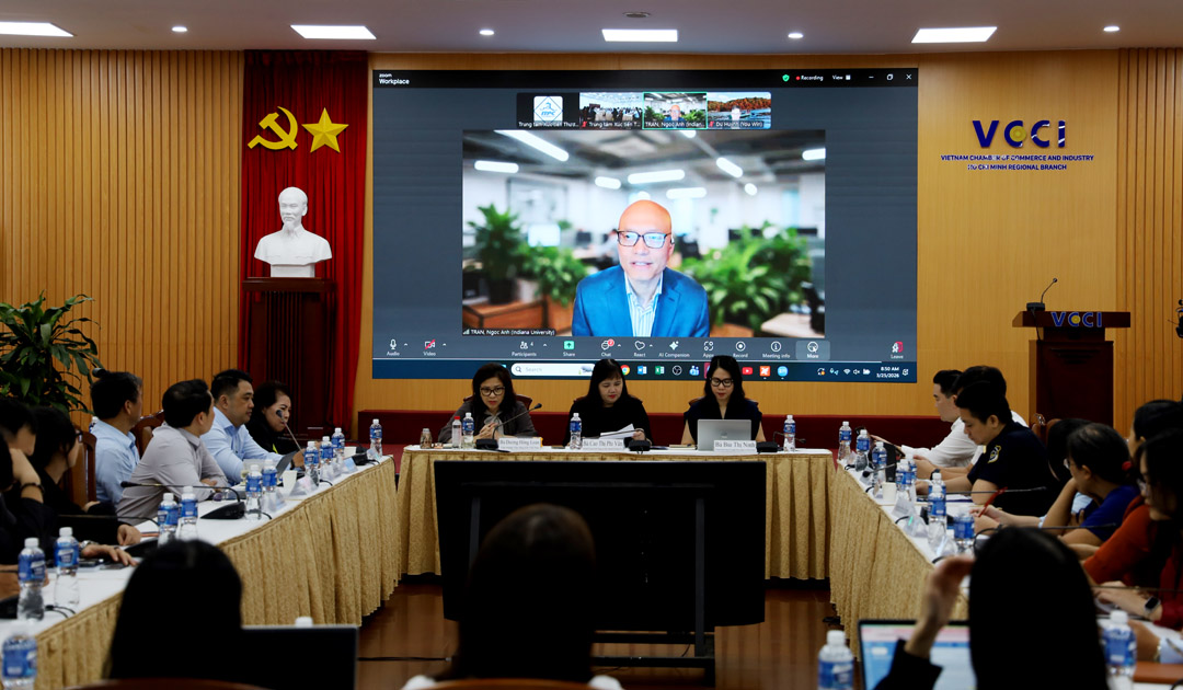 Hội thảo ngày 25-3 do ITPC, VCCI-HCM và Viện Sáng kiến Việt Nam tổ chức, GS Trần Ngọc Anh dự ở đầu cầu bên Mỹ. Ảnh: LH