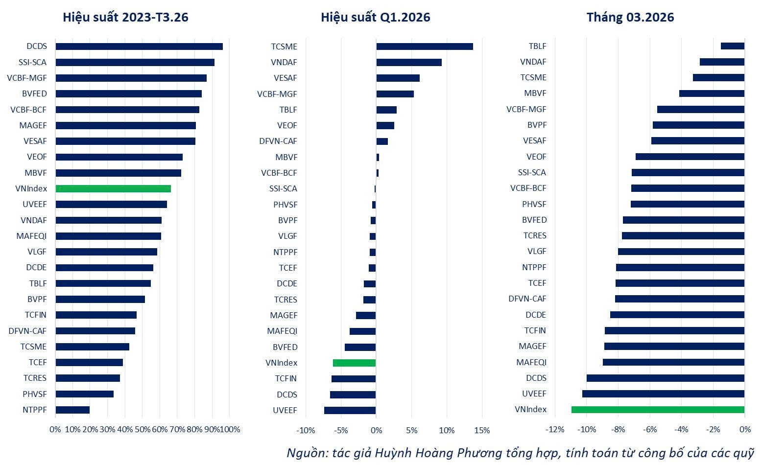 Diễn biến trong quý I/2026 mang lại một góc nhìn cân bằng hơn. Khi vai trò dẫn dắt của nhóm ít cổ phiếu vốn hóa lớn suy giảm, thị trường trở nên “cân bằng” hơn. Trong bối cảnh đó, hiệu quả của chiến lược đa dạng hóa bắt đầu thể hiện rõ. Phần lớn các quỹ mở không chỉ bắt kịp mà còn vượt hiệu suất so với chỉ số chung, thậm chí có quỹ vượt khá xa.