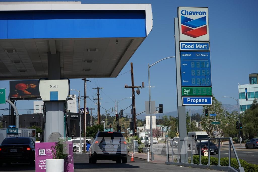 Giá xăng được niêm yết tại một trạm bán xăng ở Los Angeles, California, Mỹ ngày 9/3/2026. Ảnh: THX/TTXVN