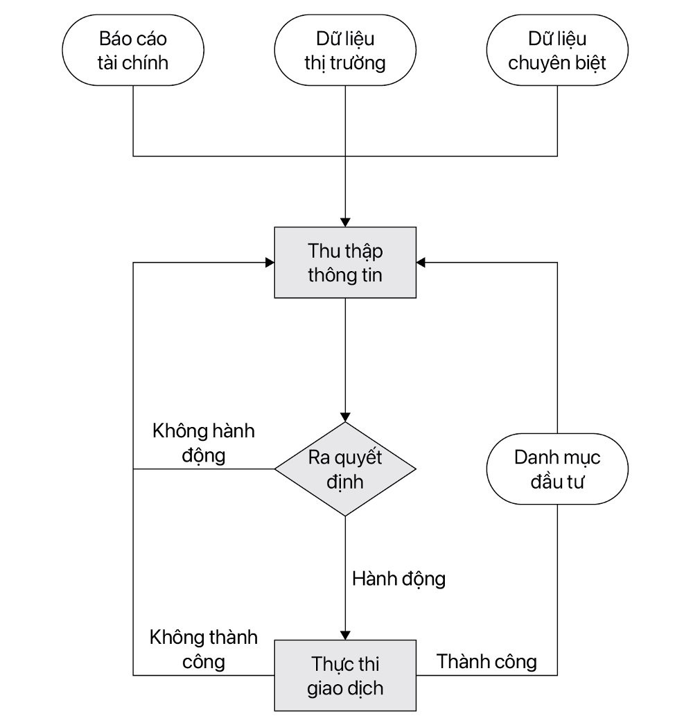 - Thu thập thông tin: Bao gồm dữ liệu thị trường (giá, khối lượng), dữ liệu chuyên biệt (vĩ mô, hình ảnh vệ tinh) và thông tin nội tại (danh mục hiện thời, khẩu vị rủi ro)