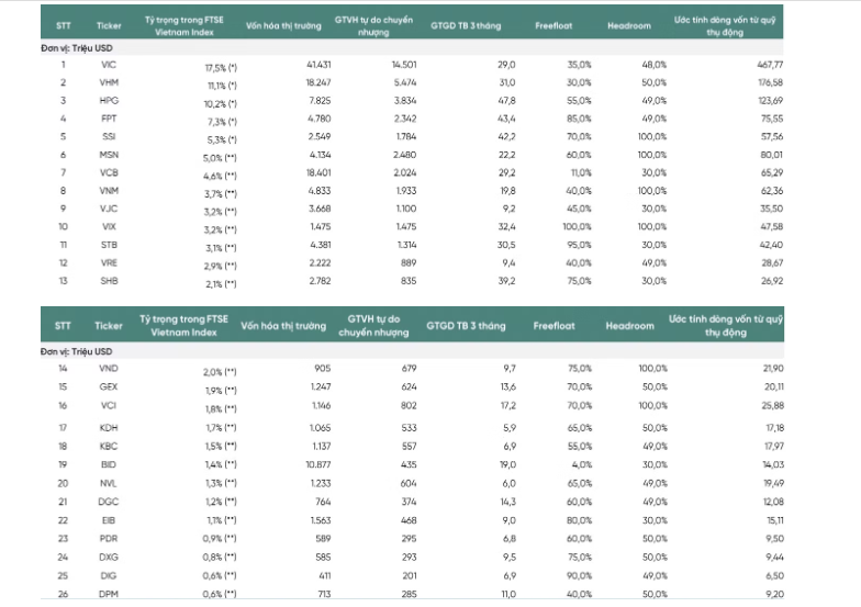 Nhóm phân tích của Chứng khoán VPBank (VPBankS) ước tính giá trị dòng vốn thụ động tối thiểu chảy vào thị trường Việt Nam đạt khoảng 1,7 tỷ USD khi toàn bộ cổ phiếu thuộc FTSE Vietnam Index chính thức vào rổ FTSE Emerging Market. Hàng loạt cổ phiếu kỳ vọng hưởng lợi từ nâng hạng.