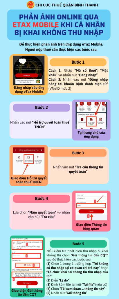 Người nộp thuế có thể phản ánh việc bị khai khống thu nhập qua ứng dụng Etax Mobile. Sau khi tiếp nhận, cơ quan Thuế sẽ làm việc với các bên liên quan để yêu cầu giải trình, kê khai lại.