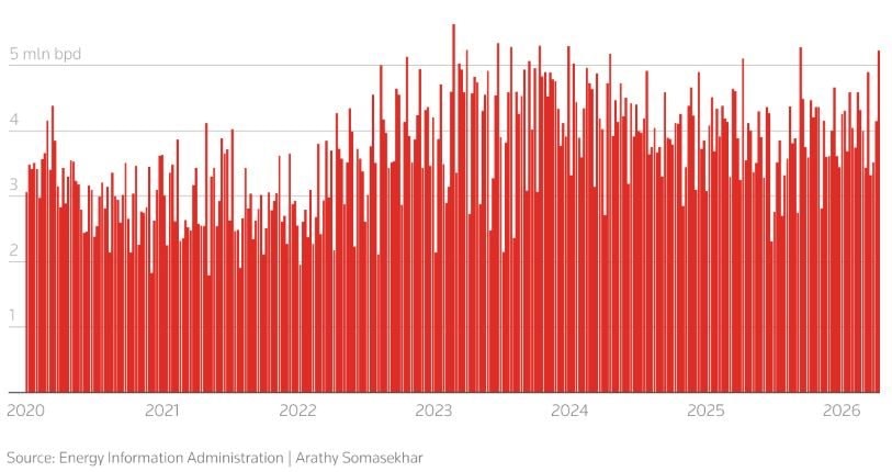 “Mức 5,2 triệu thùng/ngày trong tuần qua cho thấy thị trường đã bắt đầu chạm trần xuất khẩu. Mỗi thùng dầu tăng thêm từ đây sẽ kéo theo chi phí vận chuyển và logistics cao hơn,” ông Bekzod Zukhritdinov, một nhà giao dịch dầu tại Dubai, nhận định.
