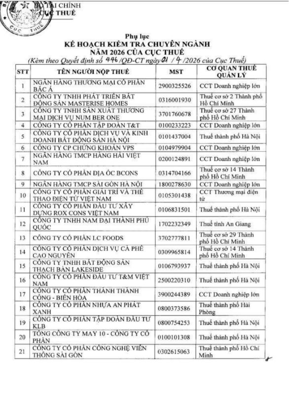 Cục Thuế vừa ban hành Quyết định 446/QĐ-CT Kế hoạch kiểm tra chuyên ngành năm 2026 của Cục Thuế.
