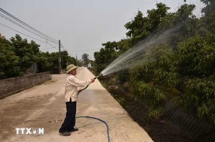 Nông dân tưới dưỡng ẩm cho cây vải. (Ảnh: Mạnh Minh/TTXVN)