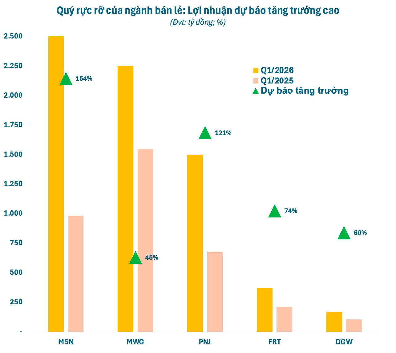 Đáng chú ý trong nhóm bán lẻ, SSI Research dự báo MSN và PNJ có thể tăng trưởng bằng lần so với cùng kỳ 2025. Cụ thể, MSN có thể lãi sau thuế 2.500 tỷ đồng, tăng 154% so với cùng kỳ 2025 và cao hơn 9% so với quý trước nhờ giá vonfram duy trì đà tăng, mảng thực phẩm và đồ uống phục hồi và hiệu quả vận hành mảng bán lẻ.
