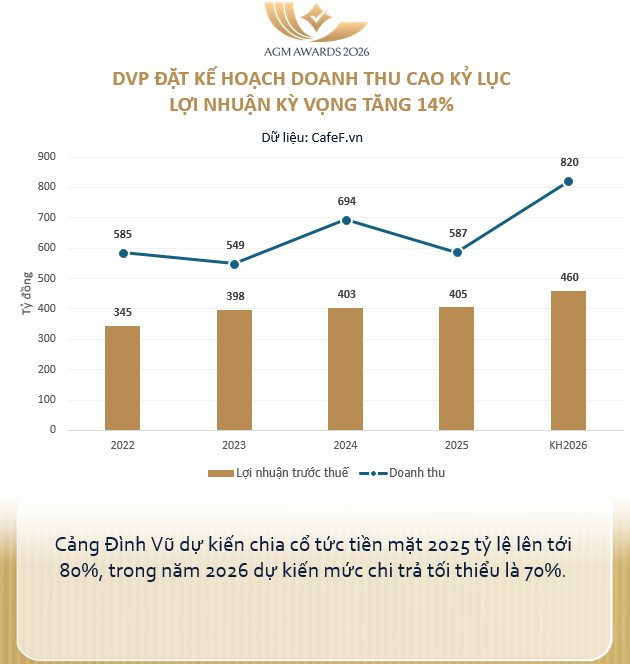 Dù vậy, DVP vẫn đặt mục tiêu doanh thu năm 2026 đạt 820 tỷ đồng và lợi nhuận trước thuế đạt 460 tỷ đồng, lần lượt tăng trưởng 40% và 14% so với năm 2025. Nếu hoàn thành, đây là mốc doanh thu và lợi nhuận cao kỷ lục của doanh nghiệp. Cảng Đình Vũ cũng đặt kế hoạch sản lượng phục vụ 2026 dự kiến đạt 650.000 teu.