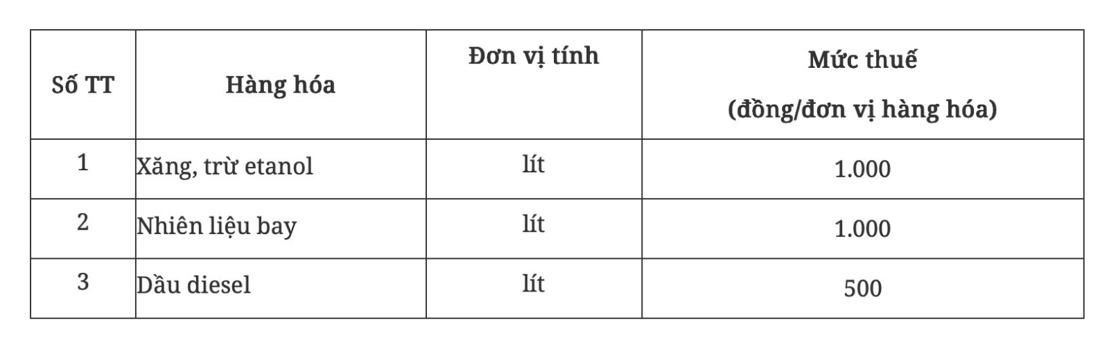 Theo dự thảo, mức thuế bảo vệ môi trường đối với xăng (trừ etanol), nhiên liệu bay, dầu diesel trong thời gian Nghị quyết này có hiệu lực thi hành (bao gồm cả thời gian điều chỉnh hiệu lực (nếu có) như sau: