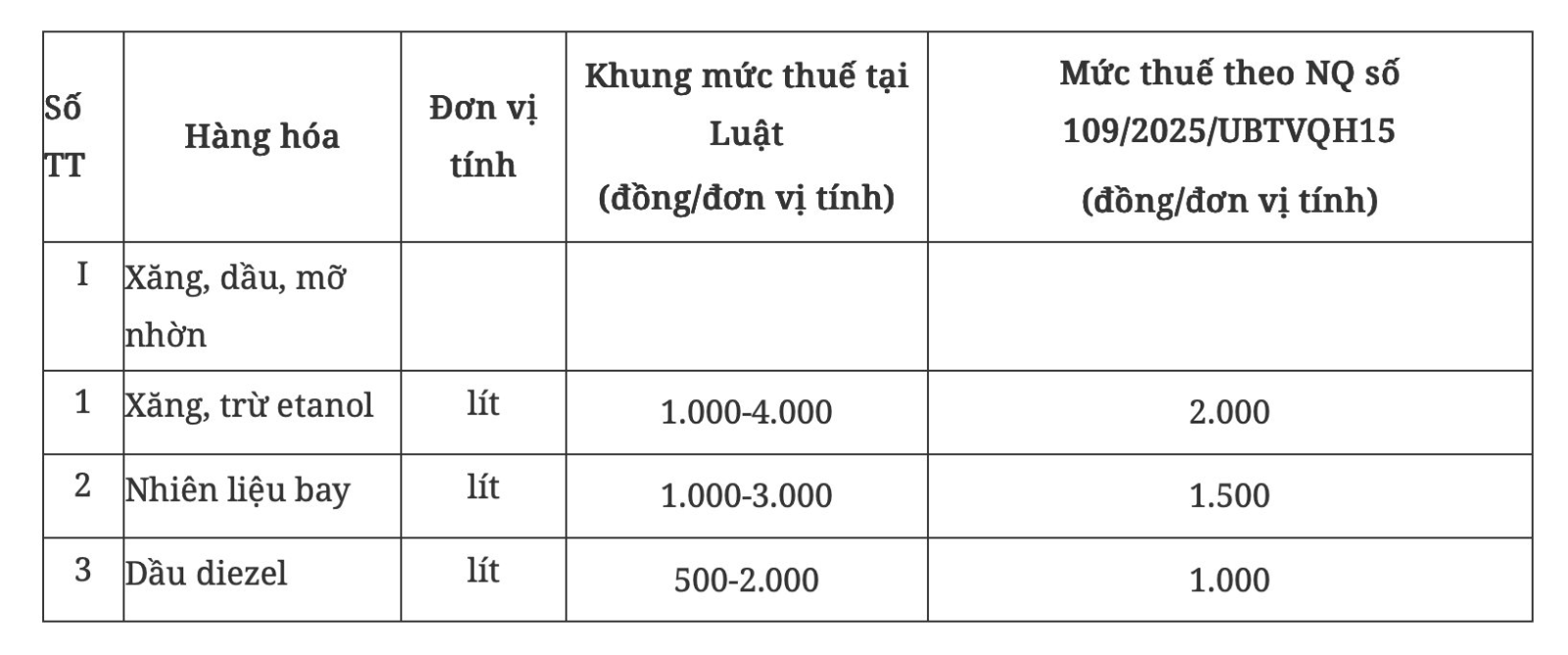 Từ ngày Nghị quyết này hết hiệu lực thi hành đến hết ngày 31/12/2026, xăng (trừ etanol), nhiên liệu bay, dầu diesel áp dụng mức thuế bảo vệ môi trường theo Nghị quyết số 109/2025/UBTVQH15 ngày 17/10/2025 của Ủy ban Thường vụ Quốc hội về mức thuế bảo vệ môi trường đối với xăng, dầu, mỡ nhờn.