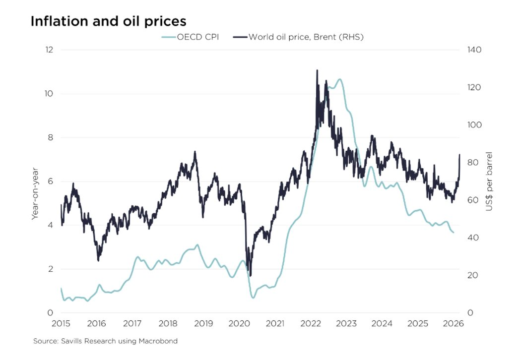 Dữ liệu cho thấy, tại các thị trường phát triển, chi phí năng lượng chỉ chiếm khoảng 5-10% trong tổng chi tiêu được dùng để tính lạm phát. Theo ước tính của Savills, mỗi khi giá dầu tăng 10%, lạm phát tổng thể có thể tăng thêm khoảng 0,1-0,3 điểm phần trăm. Đáng chú ý, giá dầu toàn cầu hiện đã tăng khoảng 40% so với đầu năm, cho thấy áp lực chi phí đang dần hiện hữu.