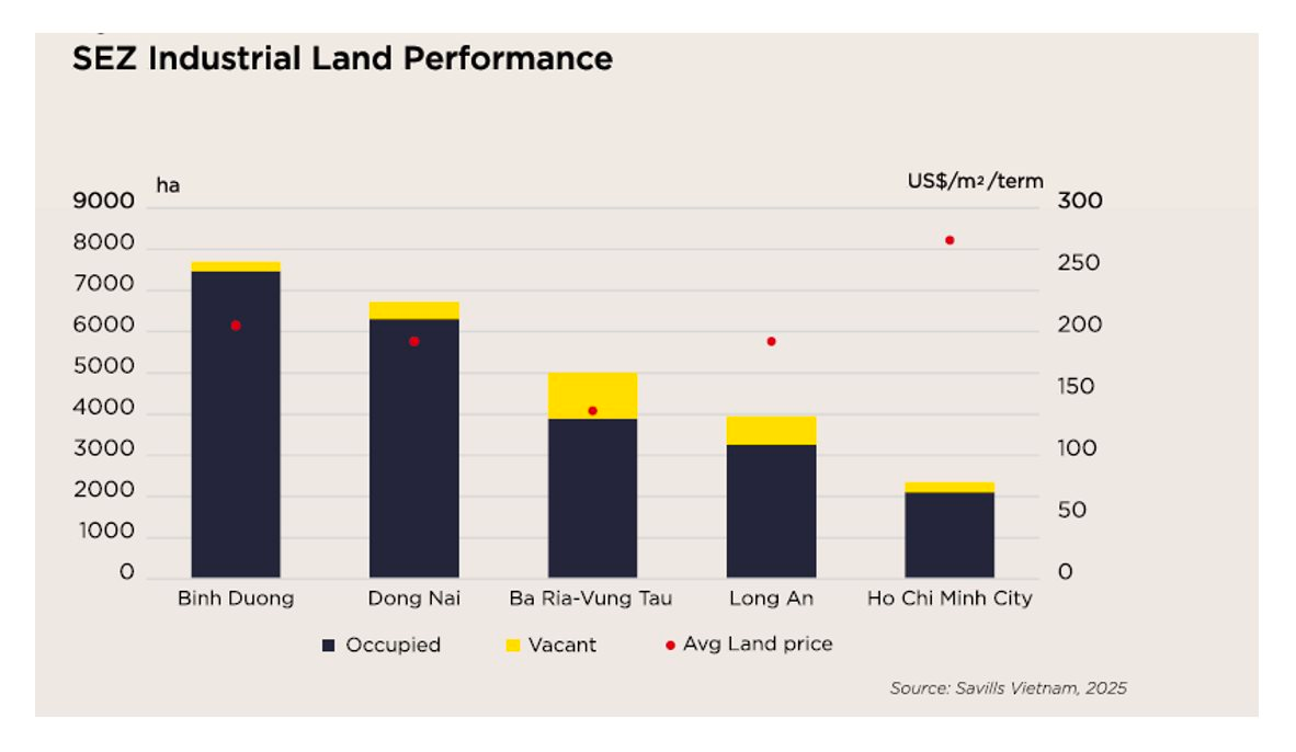 Tuy nhiên, nội lực thị trường đang cho thấy khả năng chống chịu tốt; điển hình là trong nửa cuối năm 2025, khu vực kinh tế trọng điểm phía Nam (SEZ) vẫn ghi nhận tới 25.700 ha đất công nghiệp đang hoạt động với tỷ lệ lấp đầy bình quân duy trì ở mức cao khoảng 90%. Đặc biệt tại các thị trường trọng điểm như Bình Dương, Đồng Nai và TP.HCM, tỷ lệ lấp đầy hiện đã vượt ngưỡng 90%.
