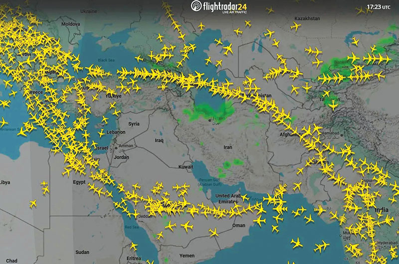 Không phận Nga, Ukraine, Iran và Iraq đóng cửa, khiến các hãng bay phải qua “hành lang hẹp” trên không phận Georgia và Azerbaijan hoặc bay xa hơn về phía Nam và Tây qua Ảrập Saudi.
