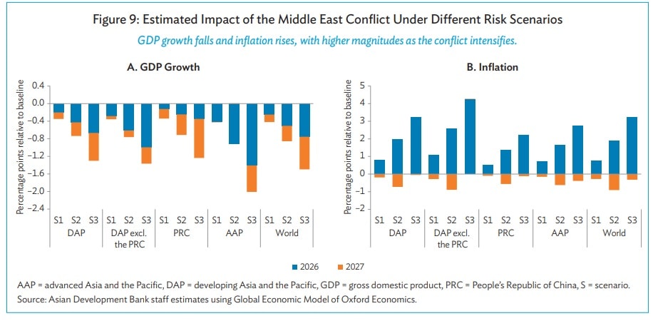Những tác động tiêu cực tới tăng trưởng sẽ nghiêm trọng nhất đối với các nền kinh tế đang phát triển ở Đông Nam Á và Thái Bình Dương, trong khi lạm phát tăng cao nhất tại các nền kinh tế Nam Á. Các kịch bản này phản ánh mức độ bất định cao về diễn biến của xung đột và các gián đoạn liên quan, do đó cần được xem xét một cách thận trọng. Bên cạnh giá năng lượng tăng cao, các kịch bản cũng tính đến sự gián đoạn rộng hơn của chuỗi cung ứng và việc thắt chặt các điều kiện tài chính toàn cầu, ADB cho biết.