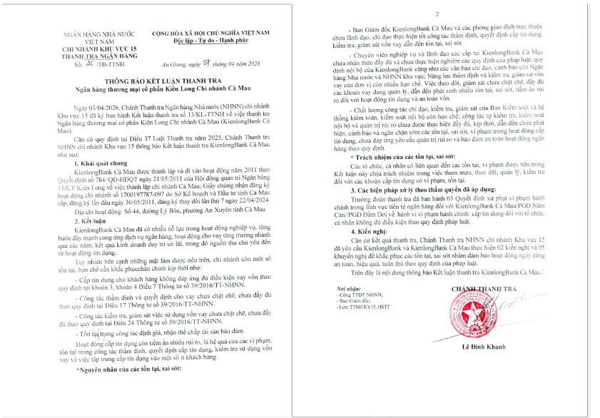 Ngày 7/4, Thanh tra Ngân hàng Nhà nước Khu vực 15 thông báo kết luận thanh tra Ngân hàng Thương mại Cổ phần Kiên Long chi nhánh Cà Mau (KienlongBank Cà Mau).