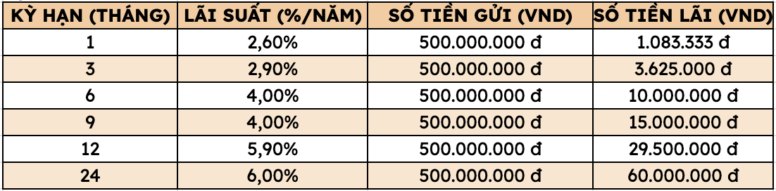 Như vậy, gửi 500 triệu đồng tại Agribank, khách hàng có thể nhận mức lãi cao nhất như sau (áp dụng với khách hàng cá nhân gửi trực tiếp tại quầy):