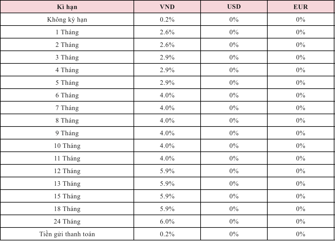 * Thông tin về lãi suất chỉ mang tính chất tham khảo và có thể thay đổi trong từng thời kỳ. Vui lòng liên hệ điểm giao dịch ngân hàng gần nhất hoặc hotline để được tư vấn cụ thể.