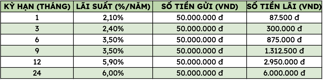 Như vậy, gửi 50 triệu đồng tại VietinBank, khách hàng có thể nhận mức lãi cao nhất như sau (áp dụng với khách hàng cá nhân gửi trực tiếp tại quầy):