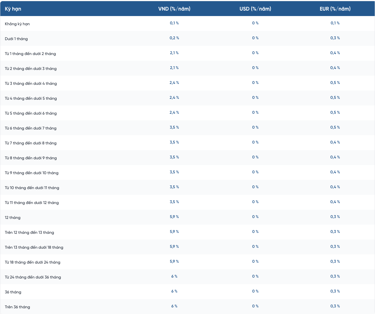 * Thông tin về lãi suất chỉ mang tính chất tham khảo và có thể thay đổi trong từng thời kỳ. Vui lòng liên hệ điểm giao dịch ngân hàng gần nhất hoặc hotline để được tư vấn cụ thể.