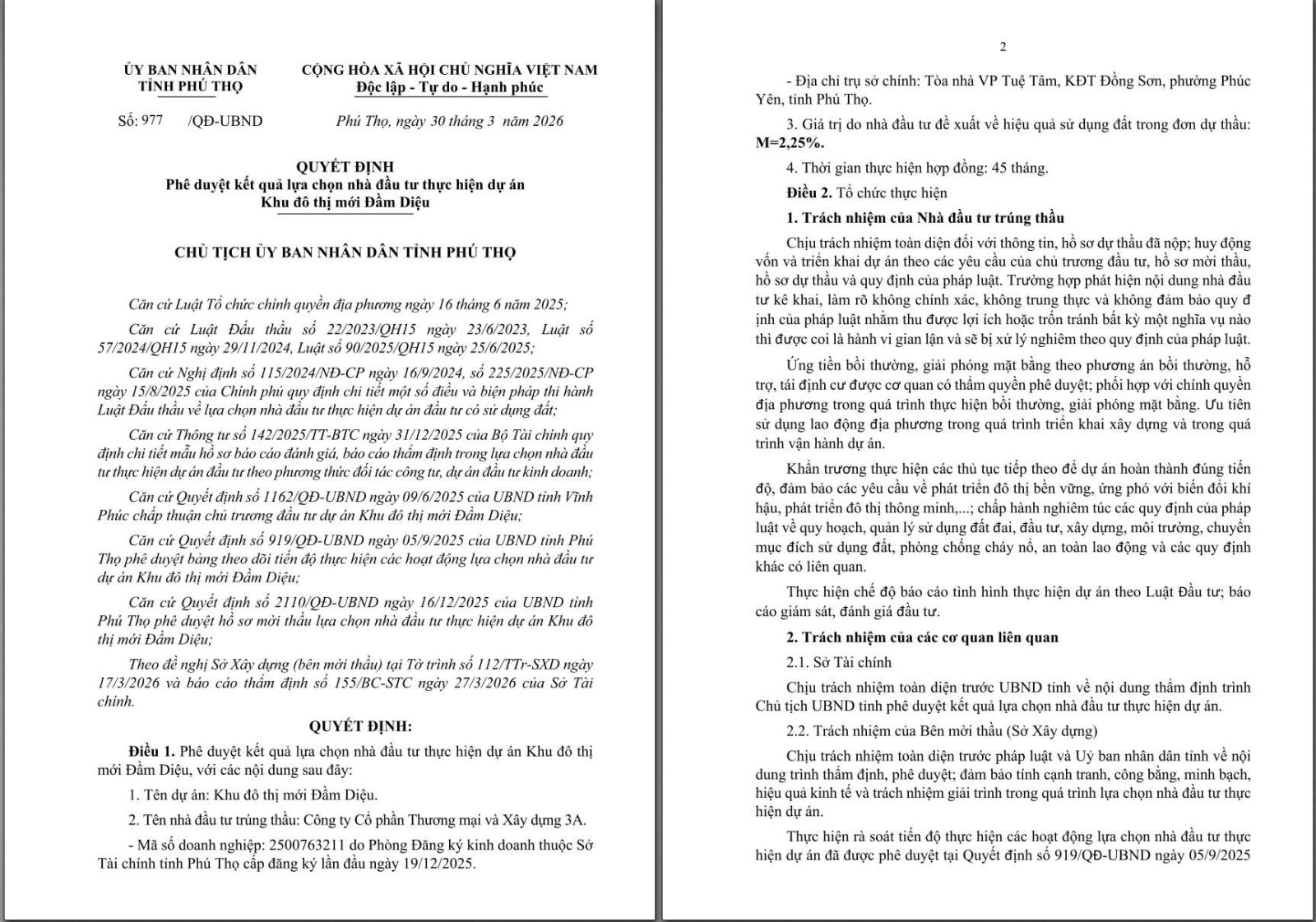 Công ty CP Thương mại và Xây dựng 3A thành lập tháng 12/2025 là nhà đầu tư của dự án Khu đô thị mới Đầm Diệu hơn 5.700 tỷ đồng tại phường Phúc Yên, tỉnh Phú Thọ.