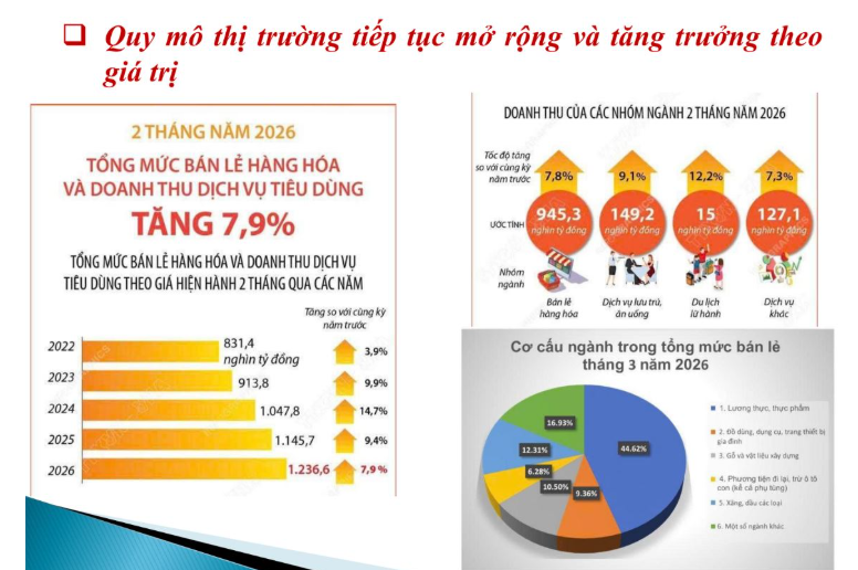 Thông tin tại buổi họp báo Triển lãm Quốc tế chuyên ngành nguyên liệu, hương liệu, phụ gia chế biến thực phẩm và đồ uống tại Việt Nam (Fi Vietnam 2026) tổ chức sáng 9/4 tại TP Hồ Chí Minh, bà Chi cho biết trong 2 tháng đầu năm 2026, tổng mức bán lẻ hàng hóa và doanh thu dịch vụ tiêu dùng tăng 7,9% so với cùng kỳ năm trước; riêng doanh thu bán lẻ hàng hóa ước đạt 945,3 nghìn tỷ đồng, tăng 7,8%. Đây là tín hiệu tích cực trong bối cảnh sức mua vẫn chịu tác động từ kinh tế thế giới.