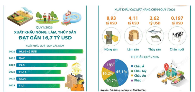 Bà Lý Kim Chi cũng cho biết, hoạt động xuất khẩu cũng ghi nhận kết quả khả quan khi kim ngạch quý I/2026 đạt 16,69 tỷ USD, tăng 5,9% - mức cao nhất trong vòng 6 năm trở lại đây (giai đoạn 2021 - 2026). Trong đó, nông sản tiếp tục chiếm tỷ trọng lớn nhất với 8,93 tỷ USD, tiếp theo là lâm sản đạt 4,11 tỷ USD và thủy sản đạt 2,62 tỷ USD.