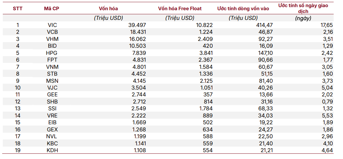 Dự kiến được đưa trực tiếp vào rổ chỉ số FTSE Emerging Market có VIC, với quy mô dòng vốn đứng đầu, khoảng 414 triệu USD. Theo sau là HPG với khoảng 147 triệu USD, cho thấy sự quan tâm lớn của nhà đầu tư ngoại đối với nhóm sản xuất - công nghiệp, đặc biệt trong bối cảnh đầu tư hạ tầng được đẩy mạnh.