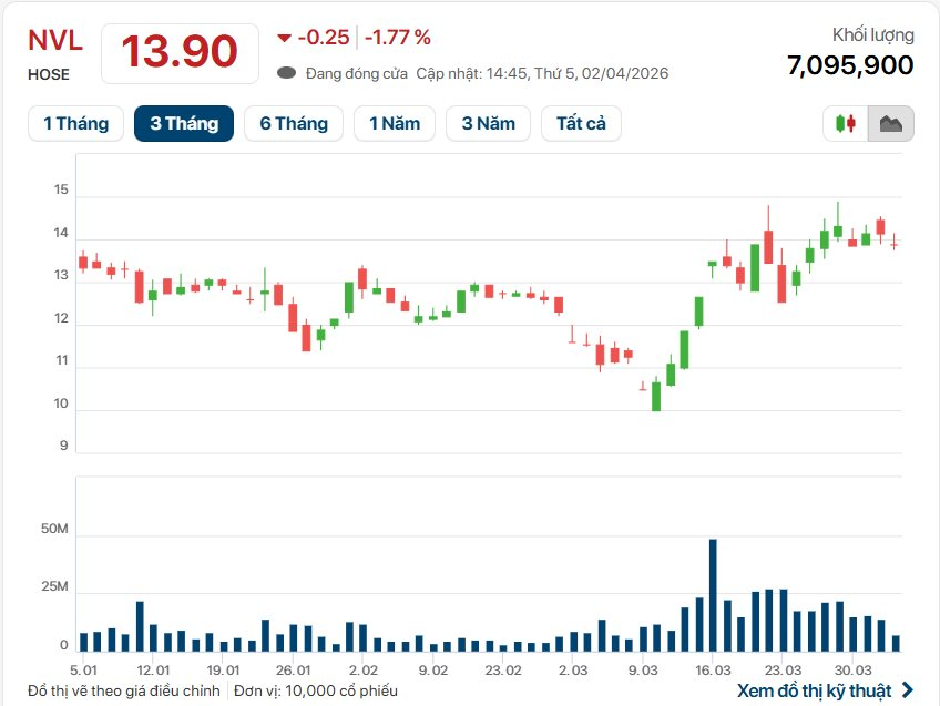 Trên thị trường chứng khoán, kết phiên 02/04, cổ phiếu NVL dừng ở mức 13.900 đồng/cổ phiếu, giảm 1,77% so với phiên liền trước, với thanh khoản đạt gần 7,1 triệu đơn vị khớp lệnh. Diễn biến này kéo vốn hóa thị trường của Novaland lùi về khoảng 31.025 tỷ đồng.