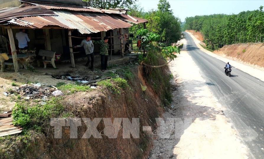 Nhiều nhà dân tại xã Phú Riềng (Đồng Nai) bị “treo” cao 12m so với mặt đường. Ảnh: Đậu Tất Thành – TTXVN
