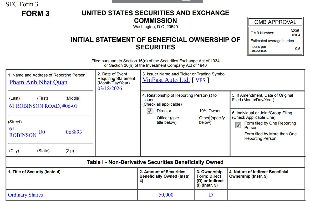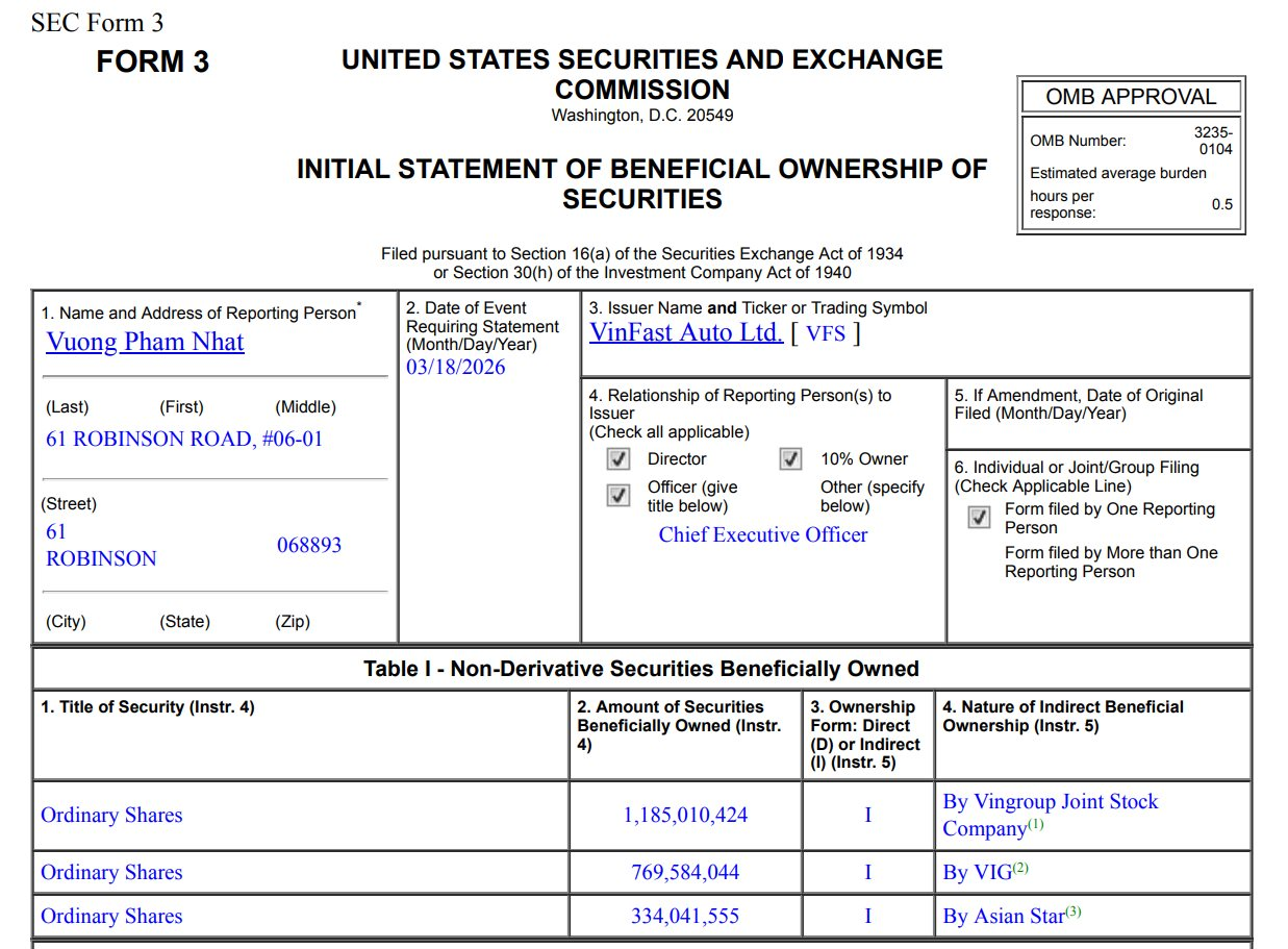 VinFast (NASDAQ: VFS) vừa có 1 loạt báo cáo về lượng cổ phiếu VFS do lãnh đạo của mình nắm giữ, trong đó phần lớn cổ phần do tổ chức có liên quan hoặc cá nhân 3 người Việt gồm tỷ phú Phạm Nhật Vượng, Chủ tịch HĐQT Lê Thị Thu Thủy, và con trai ông Phạm Nhật Vượng là ông Phạm Nhật Quân Anh nắm giữ.
