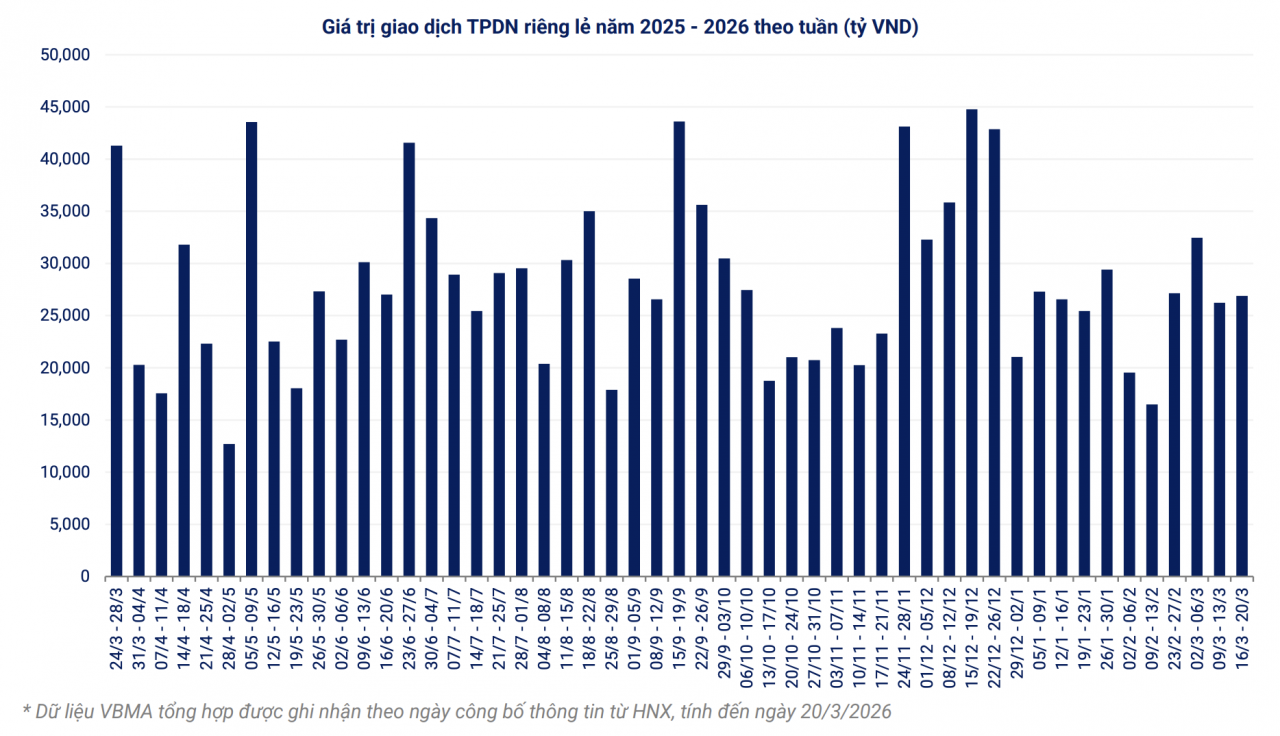 Thanh khoản trên thị trường thứ cấp ghi nhận xu hướng cải thiện nhẹ. Trong tuần qua, giá trị giao dịch trái phiếu doanh nghiệp riêng lẻ bình quân đạt 5.378 tỷ đồng mỗi ngày, tăng 2,5% so với tuần trước. Tính từ đầu năm đến nay, tổng giá trị giao dịch trái phiếu phát hành riêng lẻ đạt khoảng 257 nghìn tỷ đồng.