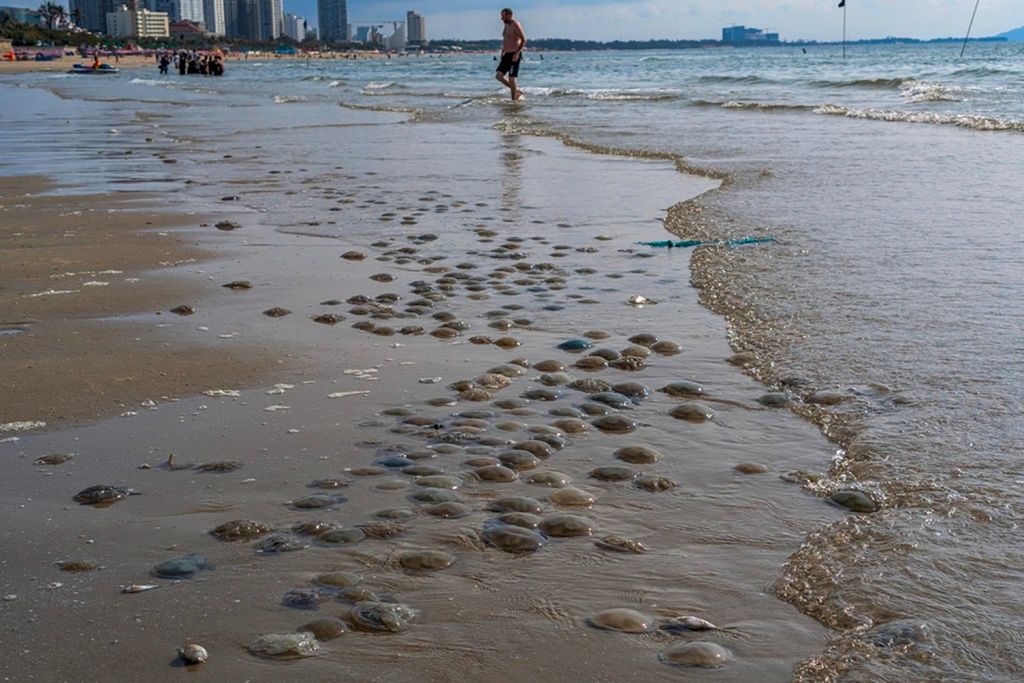Sáng 15/4, khu vực Bãi Sau (phường Vũng Tàu, TPHCM) ghi nhận tình trạng nhiều sâu biển và sứa trôi dạt vào gần bờ, tập trung dọc theo mép nước, ảnh hưởng đến hoạt động tắm biển và vui chơi của du khách.