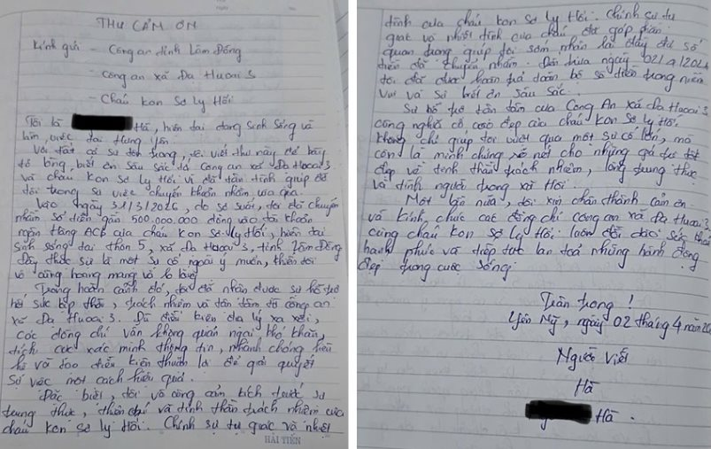 Chị N.T. Hà viết thư cảm ơn Công an xã và chị Kon Sơ Ly Hối