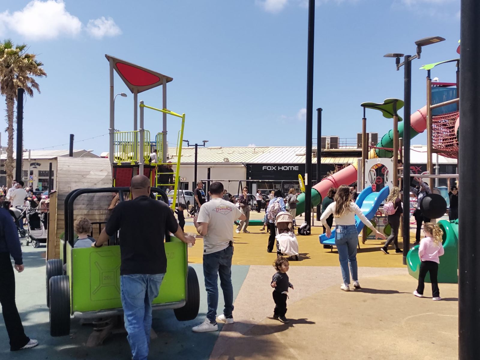 Hình ảnh trẻ em chạy nhảy, chơi cầu trượt, xích đu tại công viên ở cảng Tel Aviv vào sáng 8/4/2026. Ảnh: Thanh Bình - PV TTXVN tại Tel Aviv