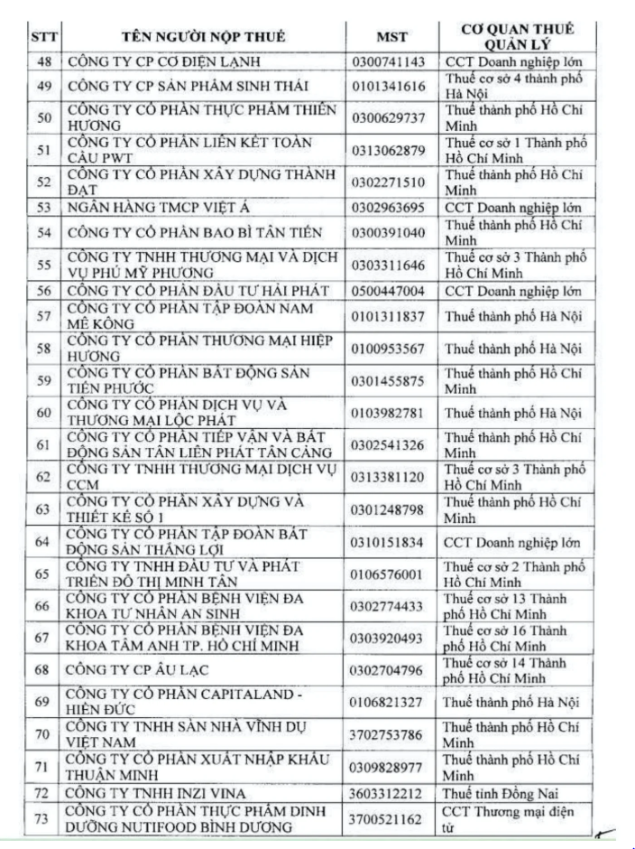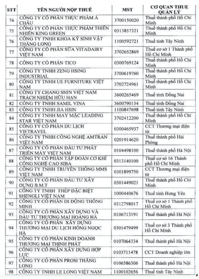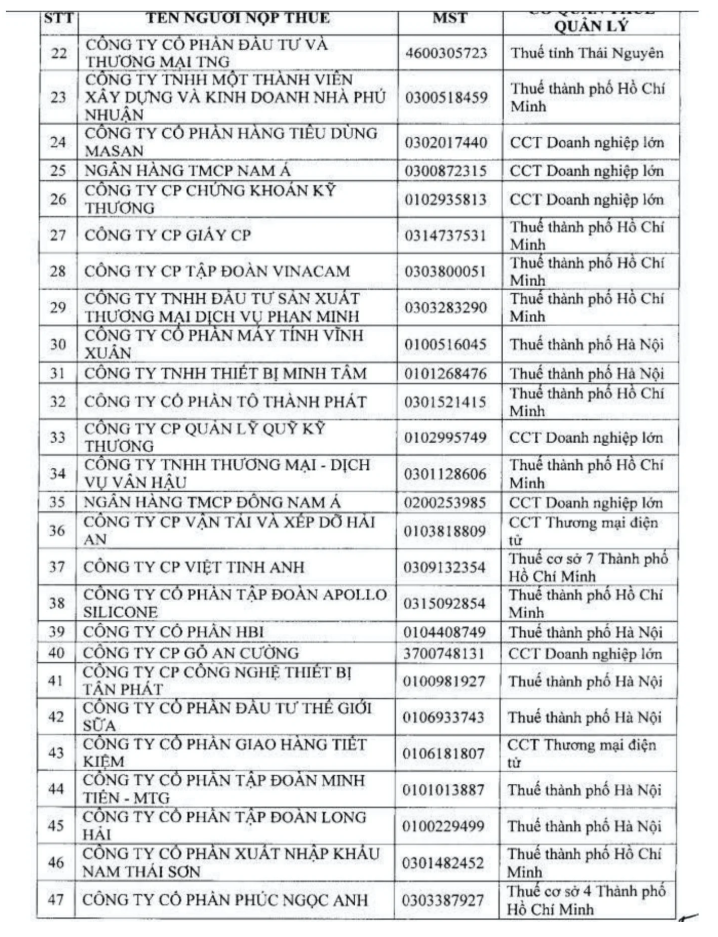 Theo đó, quyết định số 446 nêu rõ, danh sách 108 doanh nghiệp chủ yếu thuộc sự quản lý của Thuế TP. HCM, TP. Hà Nội, Chi cục Thuế Doanh nghiệp lớn…