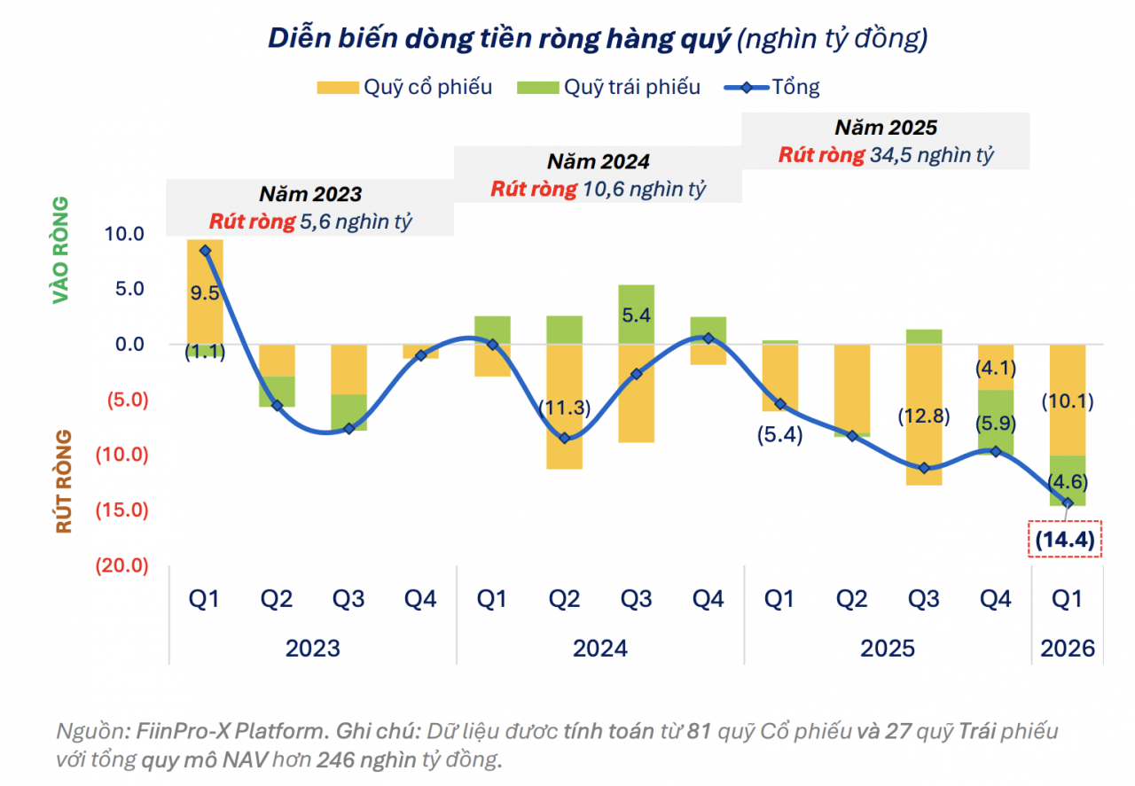 Tính chung quý I/2026, tổng giá trị rút ròng đạt hơn 14,4 nghìn tỷ đồng, tăng mạnh so với cùng kỳ và đánh dấu quý thứ 5 liên tiếp dòng vốn ở trạng thái âm. Quy mô rút ròng này cao hơn đáng kể so với quý IV/2025, cho thấy xu hướng rút vốn đang gia tăng thay vì hạ nhiệt. Lực rút ròng tiếp tục tập trung chủ yếu ở nhóm quỹ cổ phiếu, đặc biệt là các quỹ ETF và quỹ đóng.