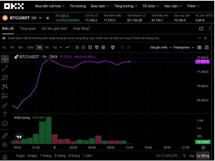 Tối 8-4, thị trường tiền số đồng loạt bật tăng mạnh. Dữ liệu từ sàn OKX cho thấy Bitcoin tăng hơn 5%, giao dịch gần 72.000 USD. Đáng chú ý, trong phiên hôm nay, Bitcoin có thời điểm vọt lên 72.700 USD trong phiên.