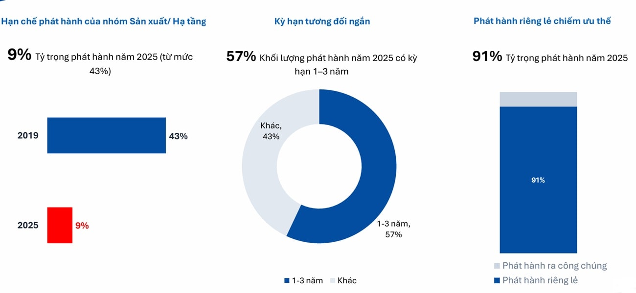 Trong khi đó, các ngành sản xuất trọng điểm như hạ tầng, công nghiệp chế biến và năng lượng chỉ chiếm 9% giá trị phát hành trái phiếu doanh nghiệp trong năm 2025, giảm mạnh so với mức 43% vào năm 2019. Do đó, việc thực hiện các giải pháp đồng bộ để tháo gỡ các nút thắt trên là rất cấp bách trong giai đoạn tới.