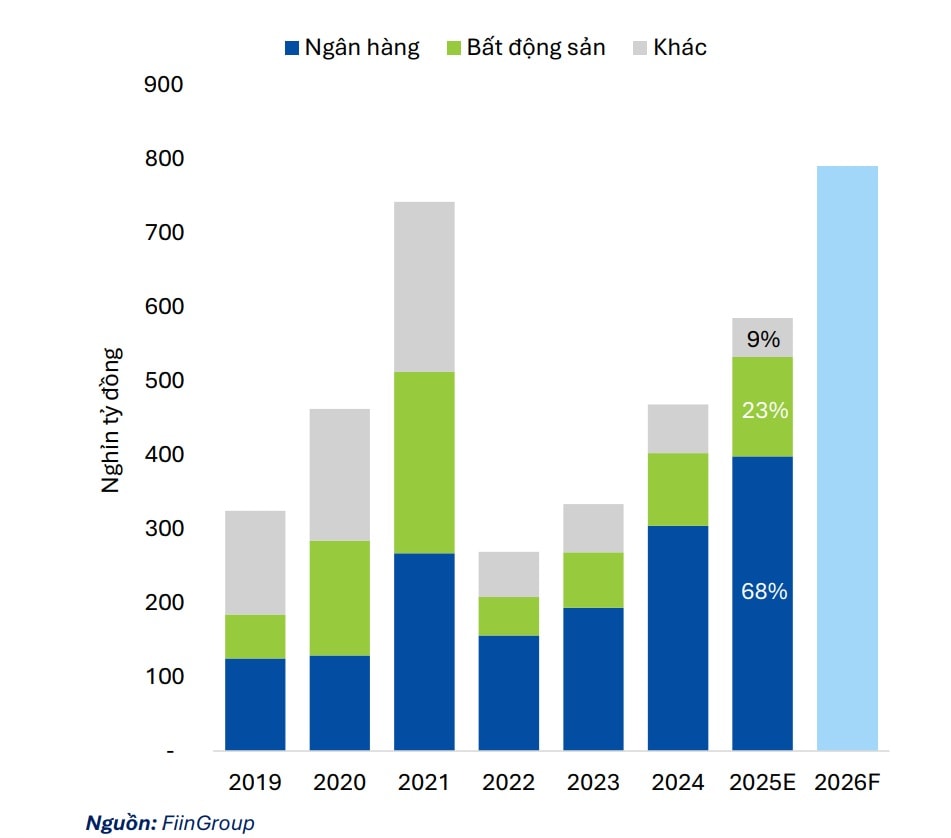 Quy mô phát hành trái phiếu doanh nghiệp của ngành bất động sản, ngân hàng và các ngành khác từ 2019-2026F.