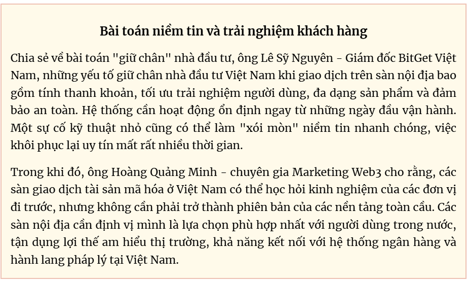 Đáng chú ý, trong giai đoạn thí điểm, chỉ những nhà đầu tư trong nước đã có sẵn tài sản mã hóa trên các nền tảng quốc tế và nhà đầu tư nước ngoài mới được phép mở tài khoản và giao dịch tại các sàn trong nước. Cách tiếp cận này được đánh giá là thận trọng, nhằm hạn chế rủi ro khi thị trường còn mới và cơ quan quản lý chưa có nhiều kinh nghiệm thực tiễn.