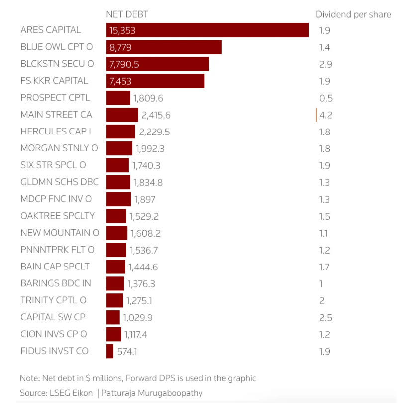 Mức nợ ròng và cổ tức trên mỗi cổ phiếu của các công ty phát triển kinh doanh (BDC) lớn, trong đó Ares Capital dẫn đầu về quy mô nợ, tiếp theo là Blue Owl Capital và Blackstone, phản ánh mức độ sử dụng đòn bẩy cao trong khi vẫn duy trì chi trả cổ tức hấp dẫn.