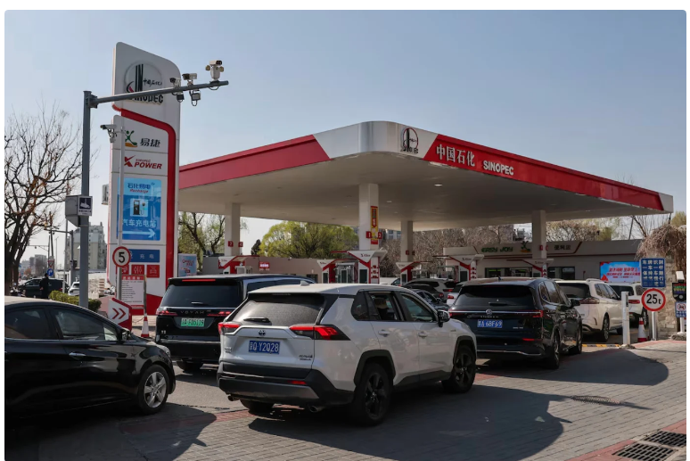 Xe cộ xếp hàng tại một trạm xăng Sinopec trước khi giá nhiên liệu được công bố tăng. (Ảnh: Reuters)