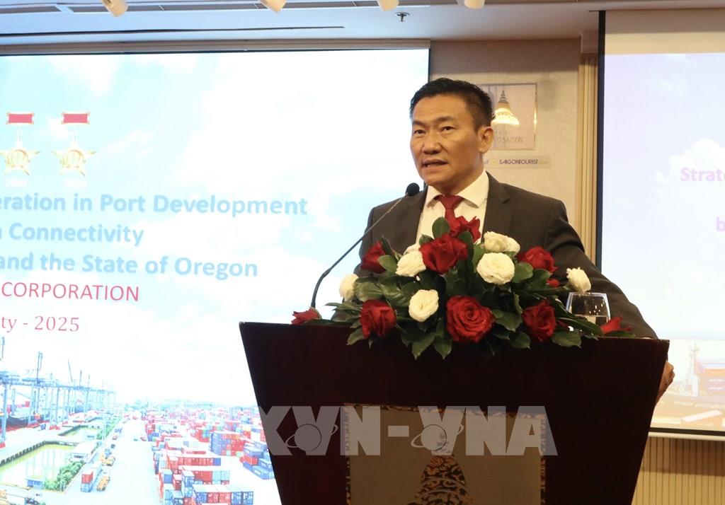 Từ góc độ khai thác và vận hành cảng biển, ông Bùi Văn Quỳ, Phó Tổng Giám đốc Tổng Công ty Tân cảng Sài Gòn, chia sẻ TP. Hồ Chí Minh sở hữu cụm cảng nước sâu Cái Mép – Thị Vải có khả năng đón siêu tàu 250.000 DWT. Ngoài ra, cụm cảng Cái Mép – Thị Vải hiện có 6 tuyến dịch vụ trực tiếp đi Bờ Tây Hoa Kỳ, rút ngắn thời gian giao hàng tận nơi (door-to-door) chỉ còn khoảng 22-30 ngày. Tổng Công ty Tân Cảng Sài Gòn đề xuất TP. Hồ Chí Minh và Bang Oregon tăng tần suất vận tải, hợp tác chia sẻ kinh nghiệm vận hành cảng thông minh (smart port), hướng tới xây dựng chuỗi cung ứng xuyên Thái Bình Dương ổn định, hiệu quả và bền vững.
