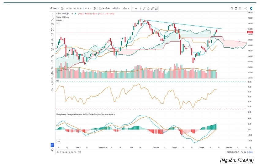 VN-Index đang tiến sát vùng đỉnh ngắn hạn sau nhịp tăng mạnh gần đây, trong bối cảnh lực cung có dấu hiệu gia tăng tại vùng giá cao. Diễn biến trong tuần giao dịch tới sẽ đóng vai trò kiểm định khả năng hấp thụ của dòng tiền khi chỉ số tiệm cận ngưỡng cản quan trọng quanh 1.850 điểm.