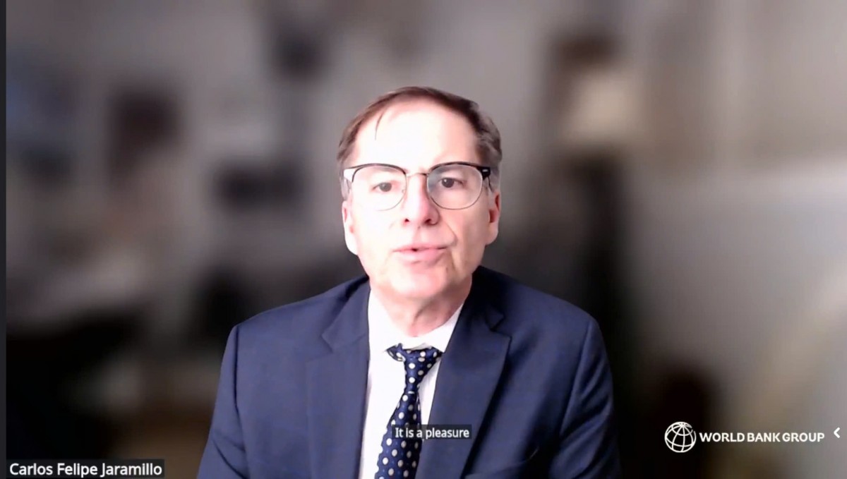 Ông Carlos Felipe Jaramillo, Phó Chủ tịch World Bank phụ trách khu vực Đông Á và Thái Bình Dương tại buổi công bố báo cáo, ngày 9/4. Ảnh chụp màn hình: Kiều Chinh/Mekong ASEAN.