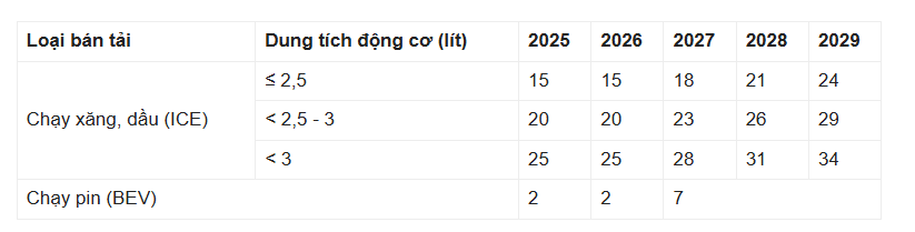 Không chỉ chịu áp lực từ quy định giao thông, xe bán tải còn đối diện với lộ trình tăng thuế tiêu thụ đặc biệt trong những năm tới. Từ năm 2026, xe bán tải bắt đầu thuộc đối tượng chịu thuế này và mức thuế sẽ tăng dần đến năm 2029, khiến giá xe có xu hướng tăng lên.