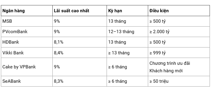 Trên thị trường, mức lãi suất 9% một năm hiện cũng xuất hiện tại một số ngân hàng khác, song chủ yếu đi kèm điều kiện về số dư tiền gửi rất lớn. Chẳng hạn, MSB áp dụng mức lãi suất này cho khoản tiền gửi từ 500 tỷ đồng với kỳ hạn 13 tháng. PVcomBank cũng niêm yết lãi suất 9% cho kỳ hạn 12-13 tháng, nhưng yêu cầu khách hàng duy trì số dư tối thiểu 2.000 tỷ đồng.