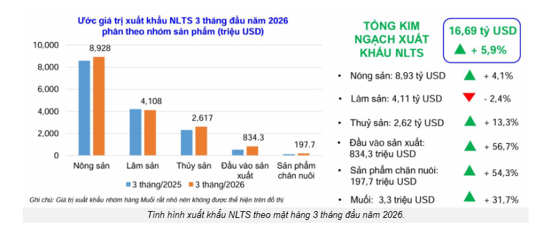 Xuất khẩu nông lâm thủy sản Việt Nam quý I/2026 đạt 16,69 tỷ đô.