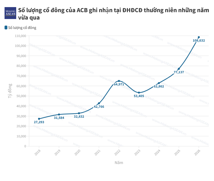 Con số 108.632 cổ đông ghi nhận tại ĐHĐCĐ 2026 đánh dấu bước gia tăng mạnh mẽ về quy mô đại chúng của ACB. Đà mở rộng này diễn ra trong bối cảnh cổ phiếu ngân hàng có năm giao dịch sôi động và quy mô tài sản vượt 1 triệu tỷ đồng.
