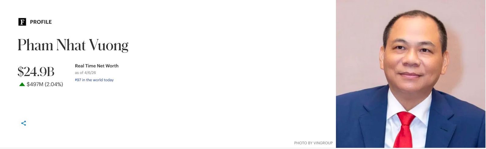 Theo bảng xếp hạng tỷ phú theo thời gian thực của Forbes, tại ngày 6/4, ông Phạm Nhật Vượng sở hữu khối tài sản 24,9 tỷ USD, xếp thứ 97 thế giới. Con số này đưa Chủ tịch Vingroup trở thành người giàu nhất Đông Nam Á.
