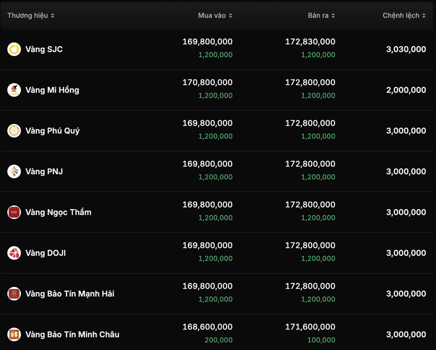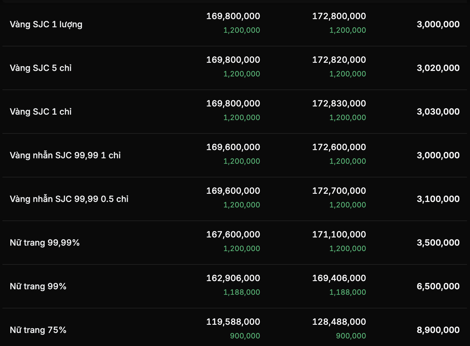 Khoảng 8 giờ 27 phút ngày 28/3, giá vàng SJC được niêm yết ở mức 169,8 - 172,8 triệu đồng/lượng (mua vào - bán ra), tăng khoảng 1,2 triệu đồng/lượng so với đầu phiên. Chênh lệch mua - bán duy trì khoảng 3 triệu đồng/lượng.